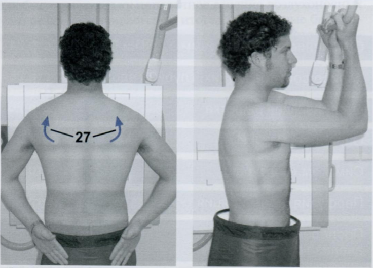 Локти кладутся тыльной стороной на ягодичную область, локти отводятся кпереди. При этом лопатки поворачиваются кпереди, чтобы не закрывать верхние отделы легких.