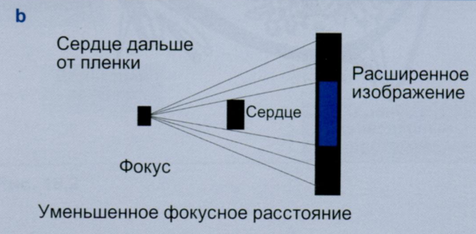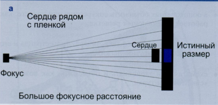 При этом фокусное расстояние тоже меньше, что приводит к большему рассеиванию рентгеновского излучения за сердцем, что усиливает эффект увеличения.
