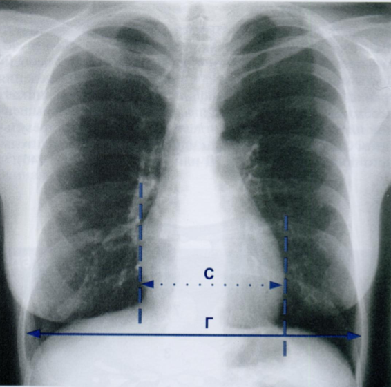У взрослых данное отношение не превышает 0,5. То есть сердце не может быть больше, чем половина внутреннего диаметра грудной клетки.