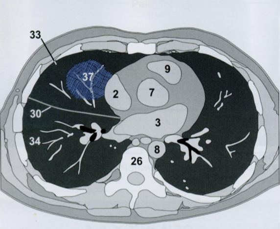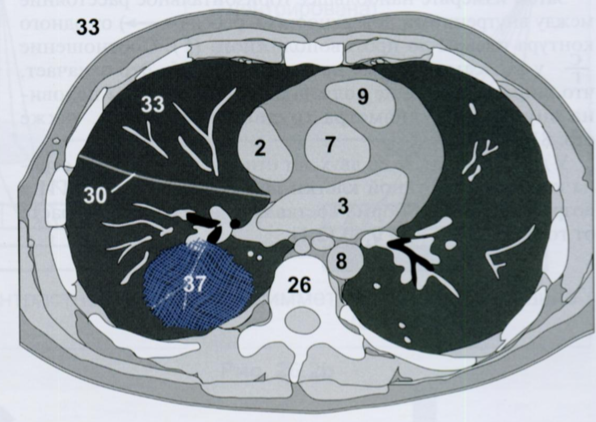 КТ на уровне правого предсердия (2), с инфильтрацией (37) в правой НД (34), которая соприкасается с ПП (2).