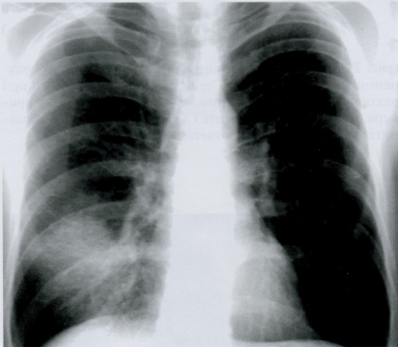 Инфильтрация и окружающих отек повышают плотность легочной ткани до плотности, эквивалентной сердечной тени.