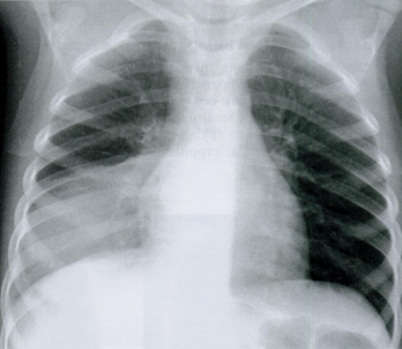Данная рентгенография грудной клетки ребенка выполнена “на крике”. Что Вы можете отметить?