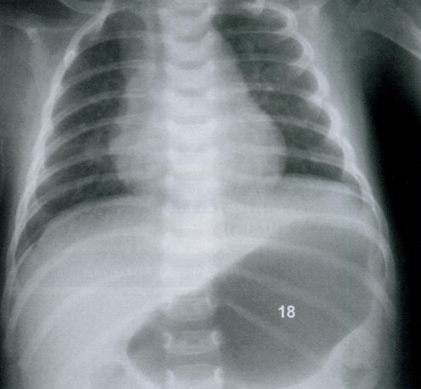 Мы видим нормальную рентгенограмму грудной клетки (чистые легочные поля), и аэрофагию (18) - воздух в желудке, проглоченный во время плача.