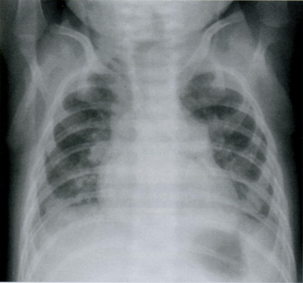 На данный момент обучения, возможно, Вы еще не знакомы с Rx-признаками пневмонии/аспирации мекония, однако визуально посмотрите на снимок и отметитьте некоторые черты, которые притягивают внимание.