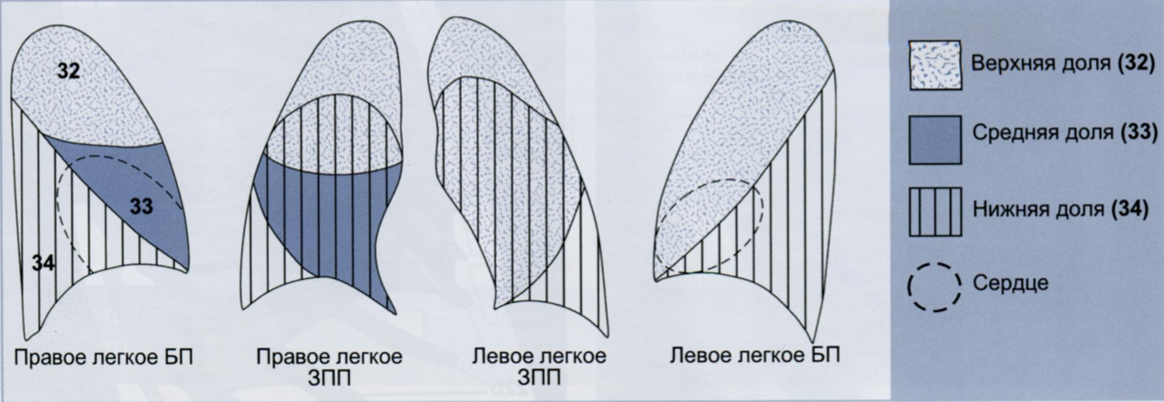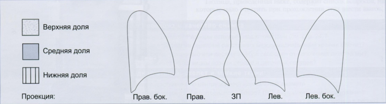 Отметьте линии, соотвествующие границам верхней, средней и нижней долей легких.