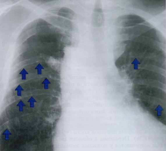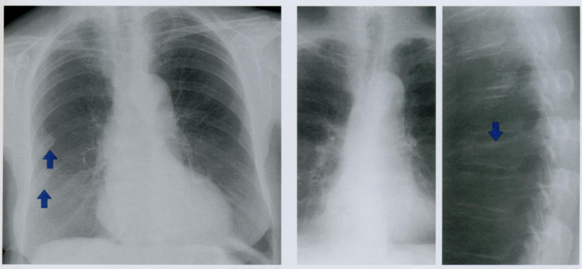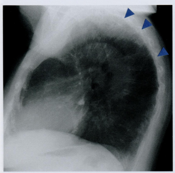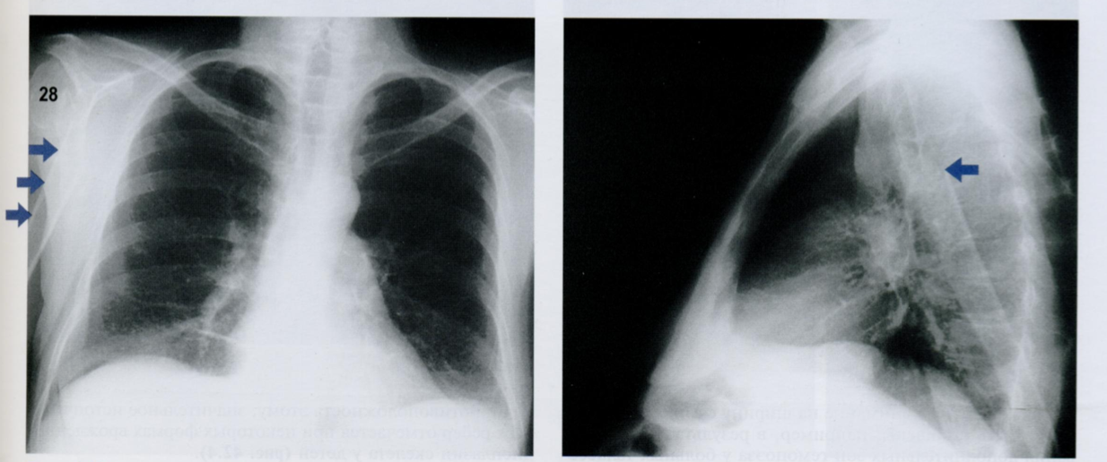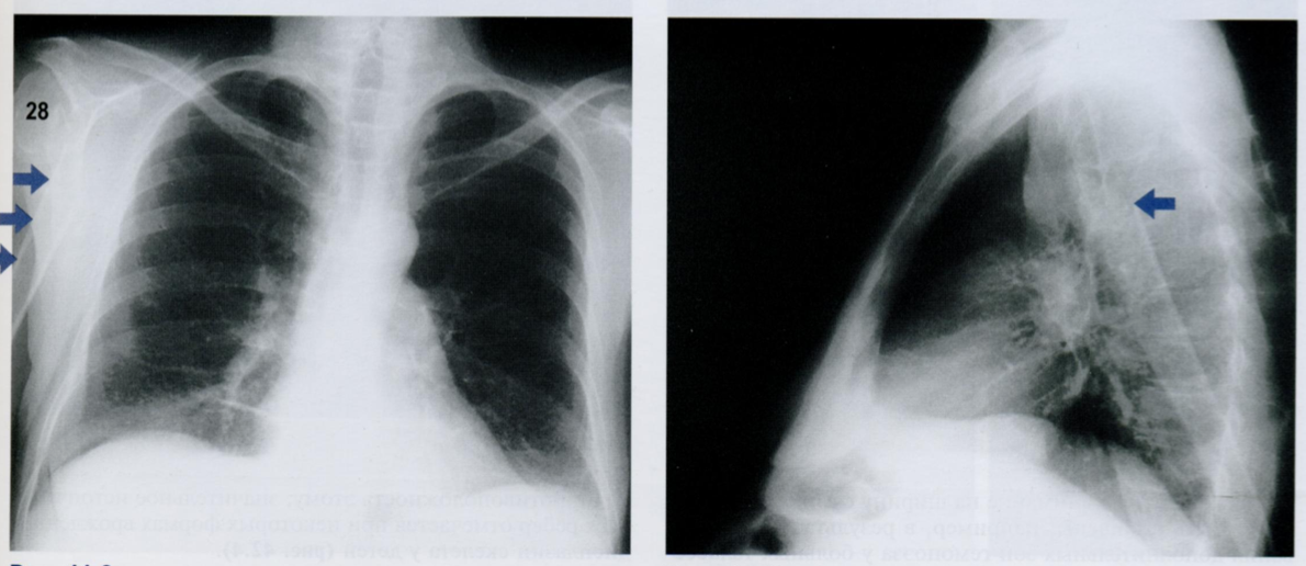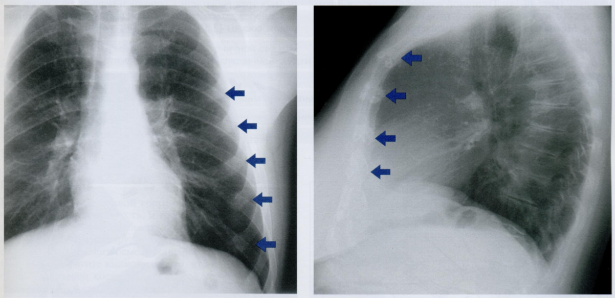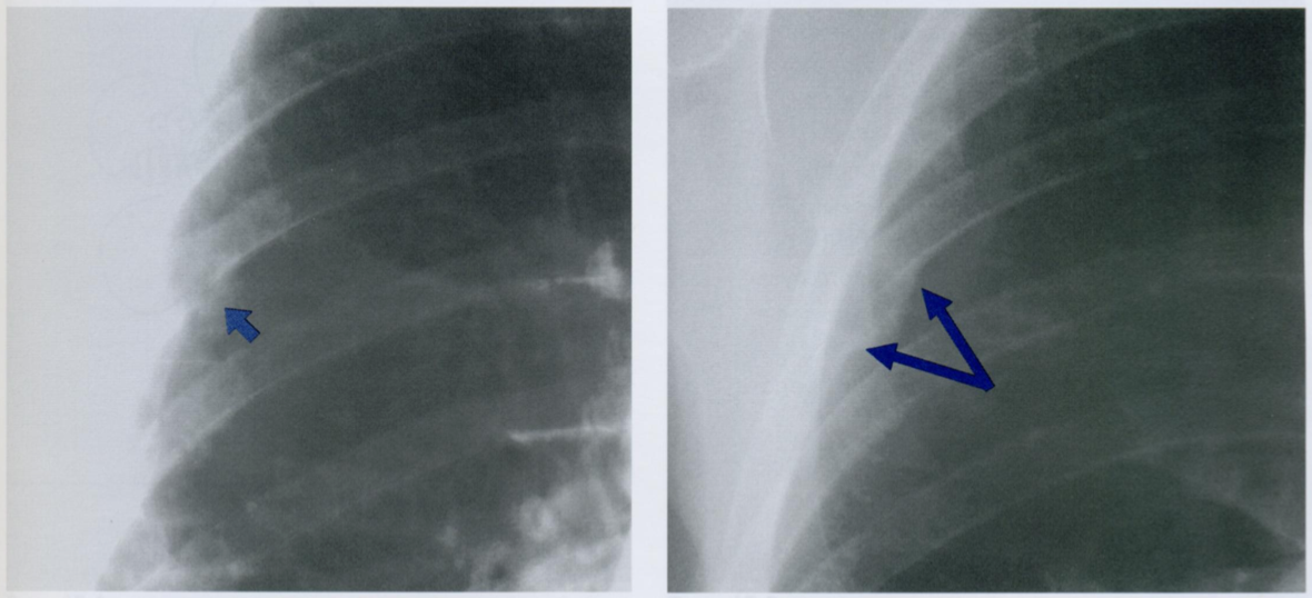 Данный снимок выполнен у одного и того же пожилого пациента с интервалом в 3 месяца. Обратите внимание на неравномерное утолщения ребер, отмеченные стрелками.
