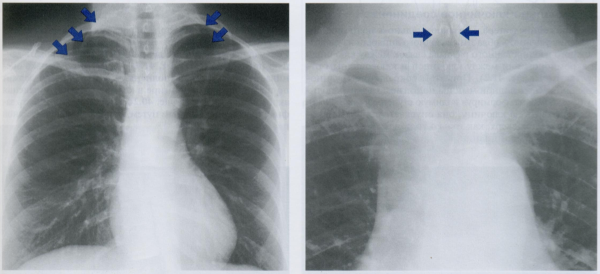 Стрелками на первом снимке отмечены заплетенные и распущенные волосы, которые приводят к появлению артефатков, которые имитируют восходящий пневмомедиастинум или подкожную эмфизему.