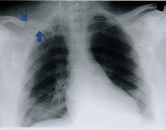 На данной карточке обратите внимание на просветления, отмеченные стрелками, которые свидетельствуют о наличии свободного воздуха в мягких тканях и средостении.