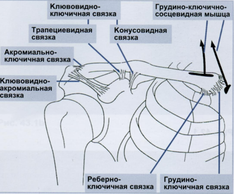На снимке мы видим разрыв связок между ключицей и клювовидным отростком (посмотрите на картинке анатомию клювовидно-ключичной связки) или между ключицей и акромионом.