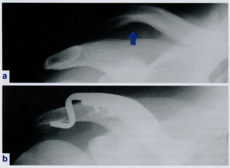 На снимке мы видим акромиально-ключичное соединение. Попытайтесь разобраться, какое повреждение тут можно увидеть.
