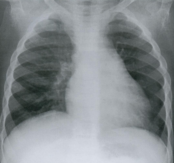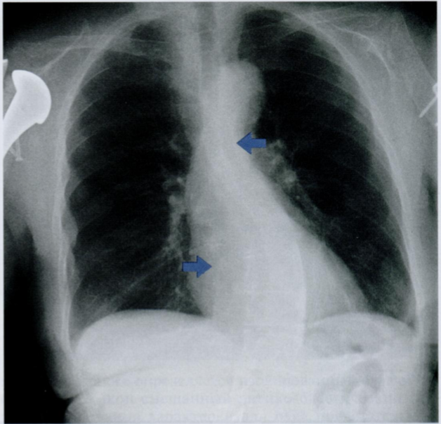 2) заметное просветление по контуру сердца или аорты, ограниченное снаружи париетальной плеврой (это то, что видно на данном снимке)