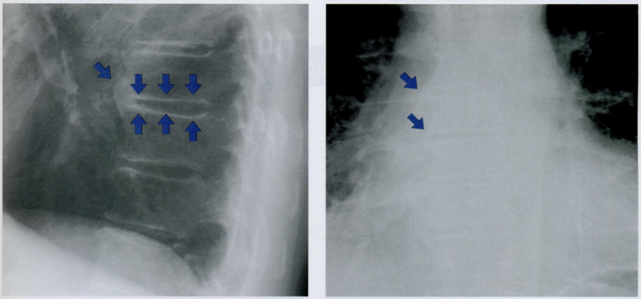 На правом снимке также представлены участки остеолиза на телах грудных позвонков +/- снижение их высоты (отмечено стрелкой). При этом эти изменения не видны в ЗПП, поэтому показана БП.