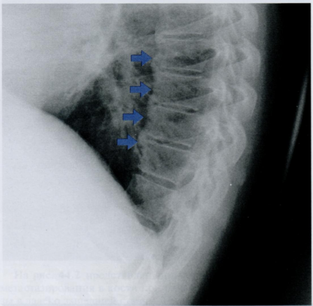 На рентгеновских снимках отмечается снижение высоты межпозвоночных дисков (хондроз) и изменения прилежащих костных структур - остеохондроз со склерозом и неровном контуром (верикальные стрелки) замыкательных плaстинок тел прилежащих позвонков.