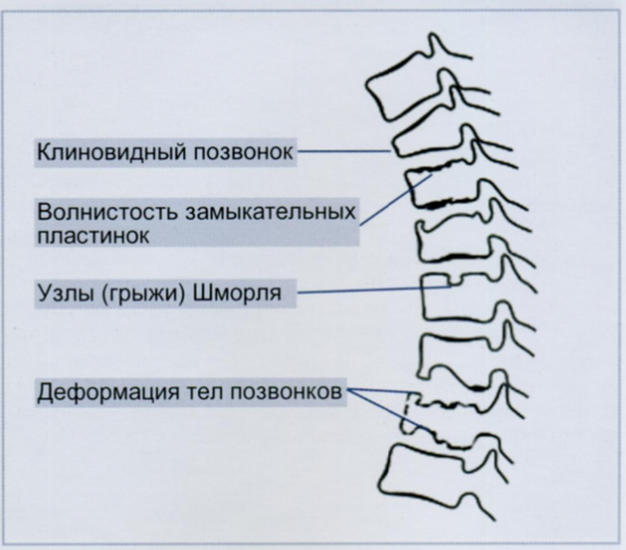 Более поздние признаки включают волнистость краев замыкательных пластинок тел позвонков и образование узлов (грыж) Шморля. Узлы Шморля возникают в местах разрывов межпозвонковых дисков, заполнены тканью, подвергшейся хрящевой трансформации, и внедряются в середину или передний край верхней и нижней замыкательных пластинок тел позвонков.