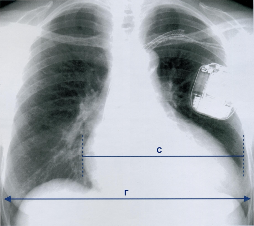 В приведенном примере максимальная ширина сердечной тени составляет 22,3 см (С), тогда как общий диаметр грудной клетки (Г) между внутренними латеральными краями ребер равен 33,5 см. Соотношение С/Г в этом случае (22,3/33,5) составляет 0,66, что подтверждает наличие кардиомегалии.