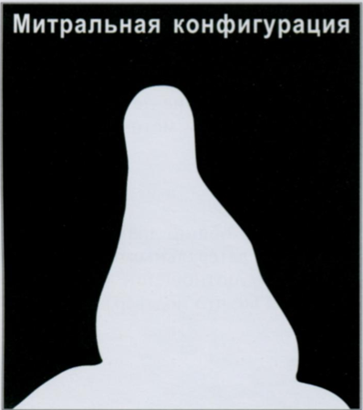 При митральном стенозе тень сердца имеет типичную митральную конфигурацию с расширенной талией. Уменьшение кровотока через митральный клапан приводит. к расширению левого предсердия, тогда как размеры левого желудомка остаются нормальными.
