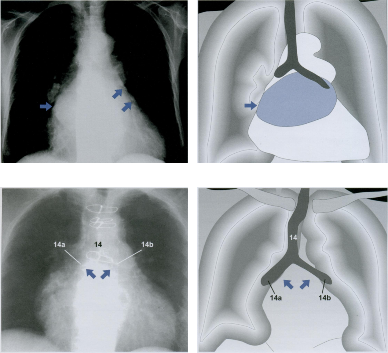 Расширение предсердия может увеличивать угол бифуркации трахеи (косые стрелки смотрят вверх) между правым (14) и левым (14b) главными бронхами (третий и четвертый снимки), подобно увеличенным подкаринным ЛУ или массивному перикардиальному выпоту.
