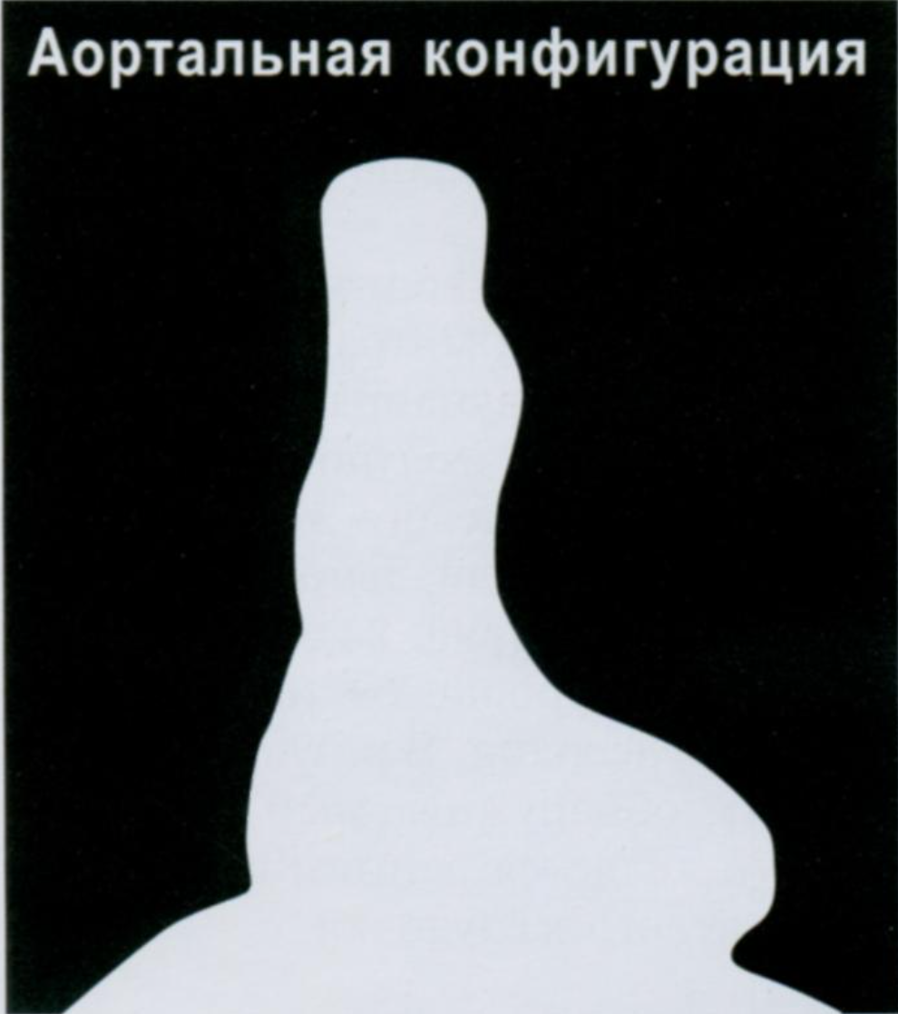 Основной механизм возникновения тот же, что и при патологии митрального клапана. Стеноз или недостаточность аортального клапана приводят к гипертрофии или дилатации левого желудочка. В результате край левого желудочка (косая стрелка вверх) смещается влево при сохранении талии сердца (косая стрелка вниз).