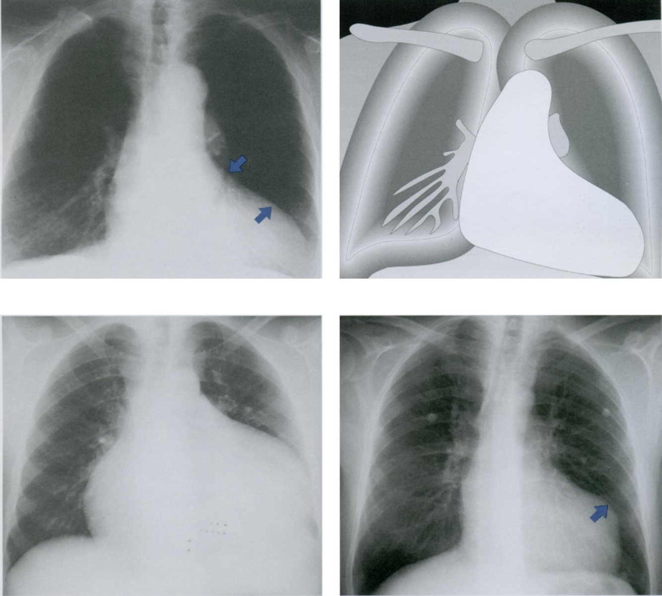 В отличие от равномерного увеличения сердечной тени при дилатации его камер (третий снимок), аневризма желудочка проявляется округлым выпячиванием (стрелка на четвертом снимке) на контуре тени сердца (четвертый снимок). В сомнительных случаях диагноз устанавливается при эхокардиографии, когда определяется парадоксальное сокращение (дискинезия) стенки левого желудочка в области аневризмы.