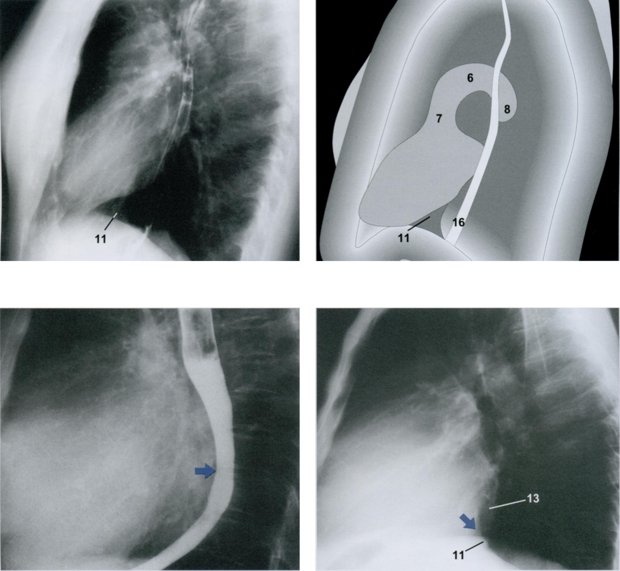 Возникающее при этом расширение левого желудочка (косая стрелка вниз) можно оценить по сужению ретрокардиального пространства (13) на рентгенограмме в БП (четвертый снимок).