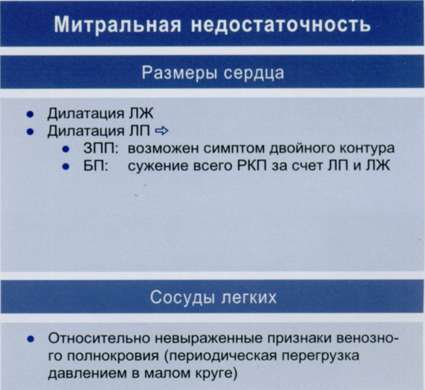 Митральная недостаточность приводит к дилатации левого предсердия с формированием митральной конфигурации тени сердца. Кроме того, двунаправленный кровоток приводит к перегрузке левого желудочка объемом.