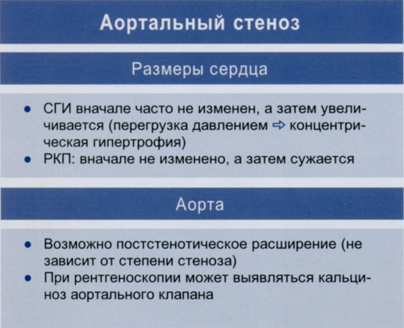 Часто наблюдается постстенотическое расширение восходящего отдела аорты, но его степень напрямую не зависит от тяжести стеноза. При рентгеноскопии нередко видны обызвествления в проекции аортального клапана, но они могут наблюдаться и при отсутствии гемодинамически значимого стеноза.