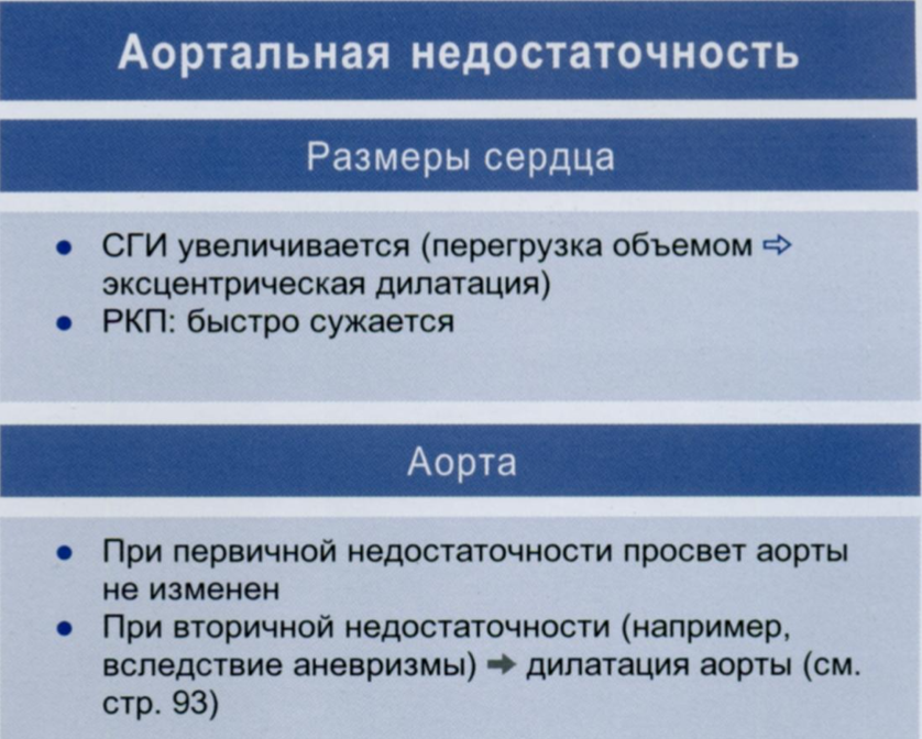 У пациентов с аортальной недостаточностью перегрузка объемом приводит к ранней эксцентрической дилатации левого желудочка, которая формирует аортальную конфигурацию левого края тени сердца. Поэтому на рентгенограммах в ЗПП увеличение СГИ возникает раньше, чем при аортальном стенозе.