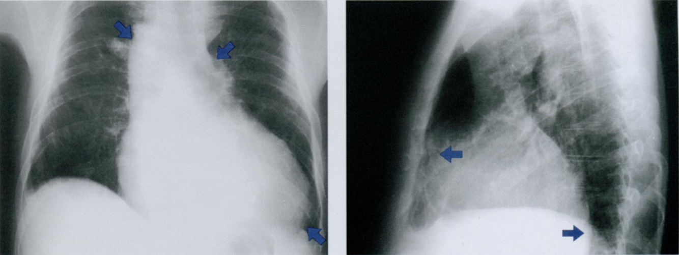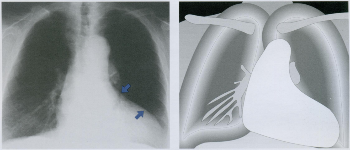 Клапан становится неполноценным из-за миогенной дилатации правого желудочка и кольца трехстворчатого клапана. Дилатация правого предсердия приводит к значительному расширению тени сердца вправо на рентенограмме в ЗПП (стрелки).