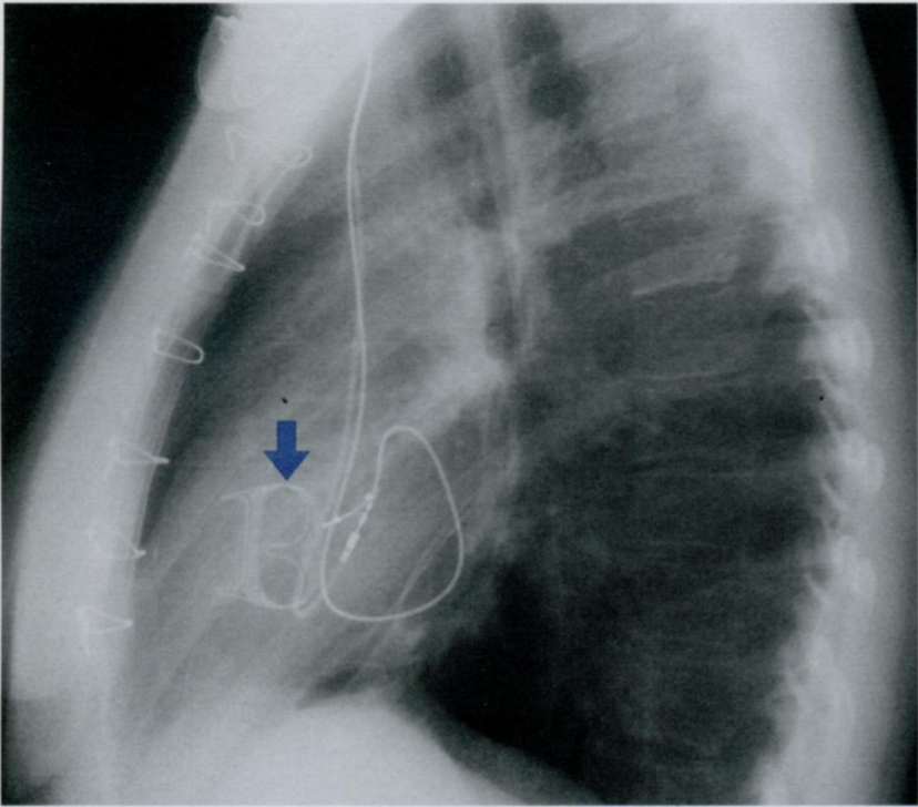 В данном случае проведено протезирование клапана (стрелка смотрит вниз) и имплантация искусственного вводителя ритма.