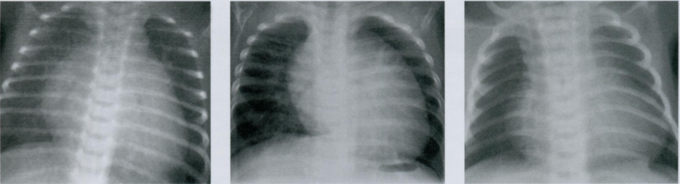 В противоположность этому, такие пороки, как атрезия легочного ствола (третий снимок) и тетрада Фалло характеризуются уменьшением легочного кровотока, что вызывает обеднение легочного рисунка (повышение прозрачности легочных полей) на рентгенограммах грудной клетки.