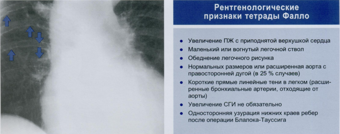 Рентгенологическими симптомами являются увеличение правого желудочка с приподнятостью верхушки сердца (косые стрелки на первом снимке), маленький или отсутствующий легочной ствол (косая стрелка слева на первом снимке) и, в 25 % случаев, правостороннее расположение дуги аорты (косая стрелка справа на первом снимке).