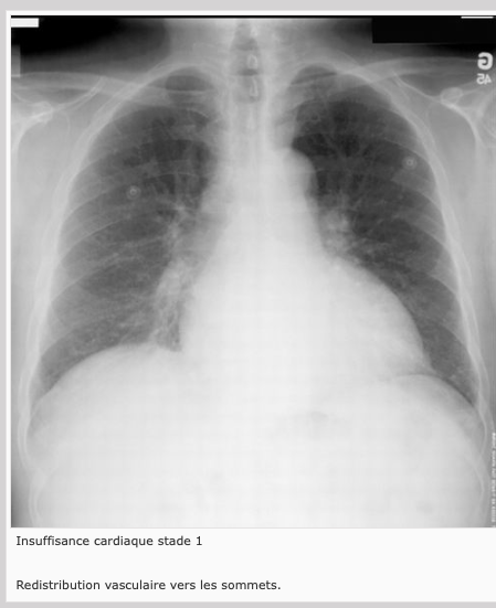 1) Redistribution vasculaire: vaisseaux des sommets apparaissent aussi ou plus proéminents qu’aux bases, ce qui est le contraire de la normale.