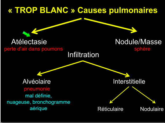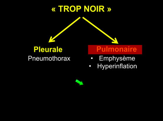 Une anomalie pulmonaire ou pleurale se manifestera sur la radiographie par un aspect soit trop blanc, soit trop noir.