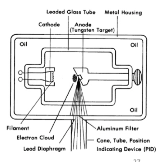 high voltage generator that modifies incoming voltage and current into an x-ray bea, of desired peak kilo-voltage (kVp) and current (mA)