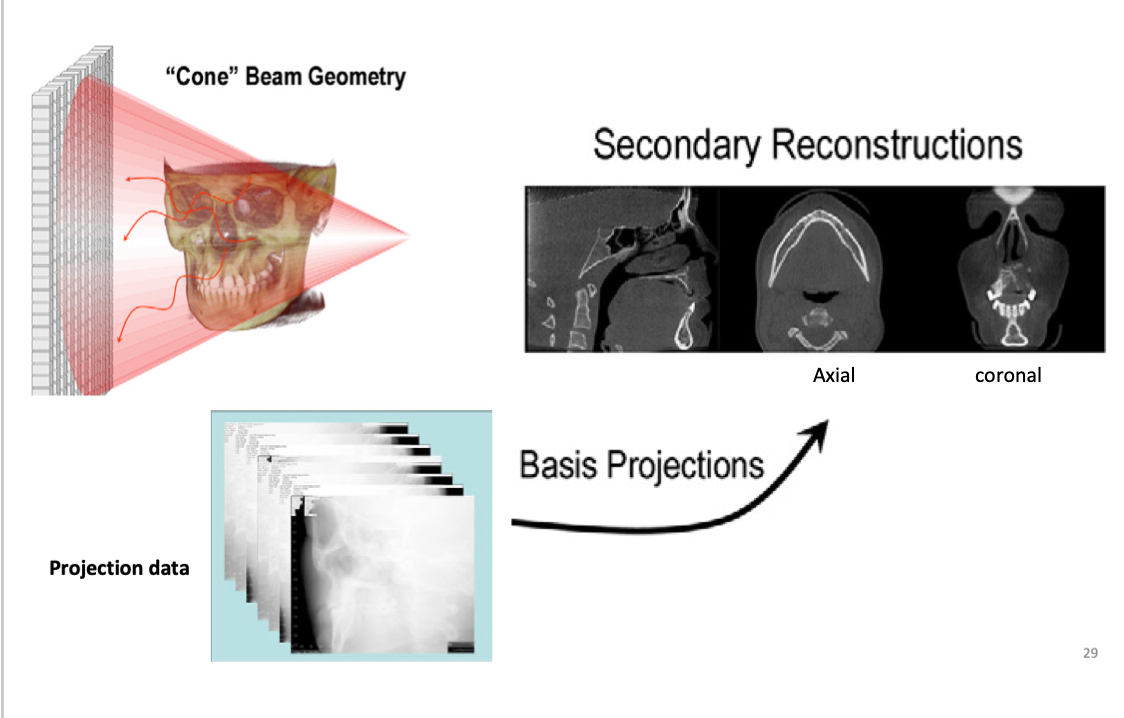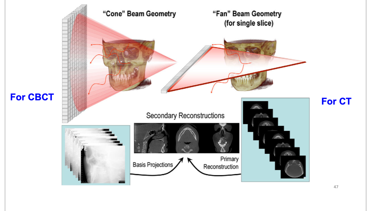 in CBCT, basis projections form secondary reconstructions whereas in CT primary reconstructions form secondary reconstructions