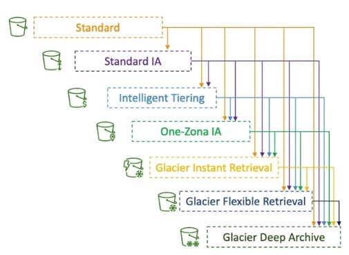 Transition actions – These actions define when objects transition to another storage class. For example, you might choose to transition objects to the S3 Standard-IA storage class 30 days after creating them, or archive objects to the S3 Glacier Flexible Retrieval storage class one year after creating them. For more information, see Using Amazon S3 storage classes.