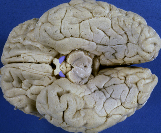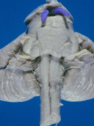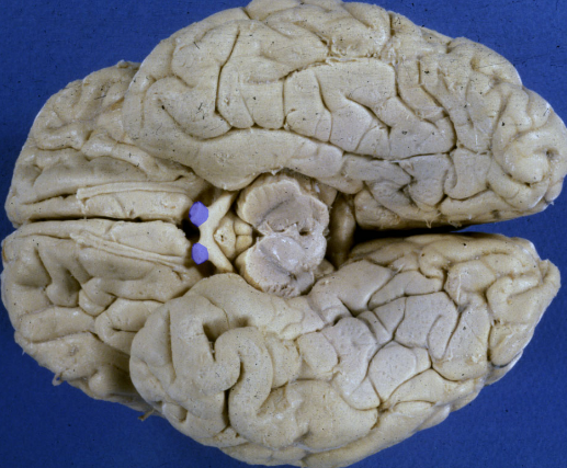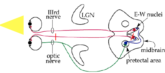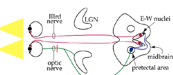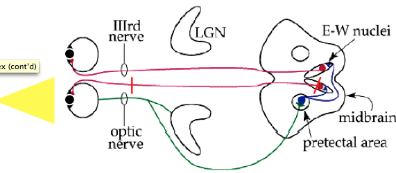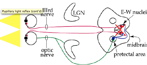 Damage to medial midbrain (ie. Bilateral Pretectal nuclei and/or both EW nuclei)