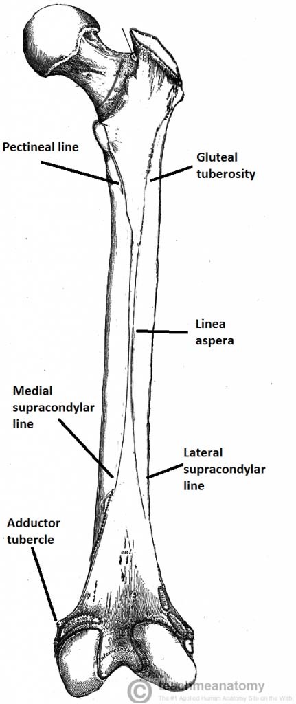 Describe the features of the linea aspera in the proximal region of the posterior femur