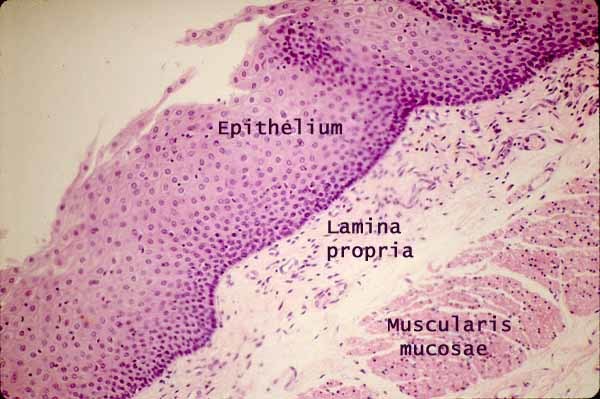 - Lamina propria – loose connective tissue bearing blood & lymph vessels, smooth muscle and immune cells