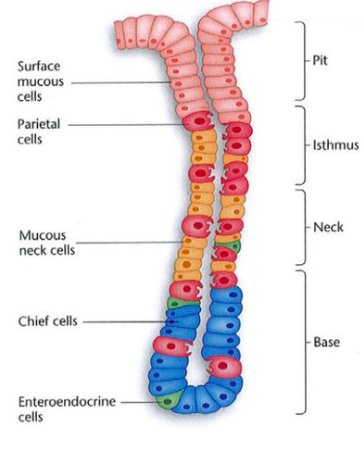 Gastric enteroendrocrine cells (G cells) are cells found at the base of the gastric gland which secrete gastrin