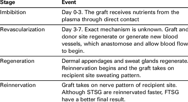 Name and briefly summarise the phases of integration of a free mesh skin graft. Include in your answer the expected timeframes for each.