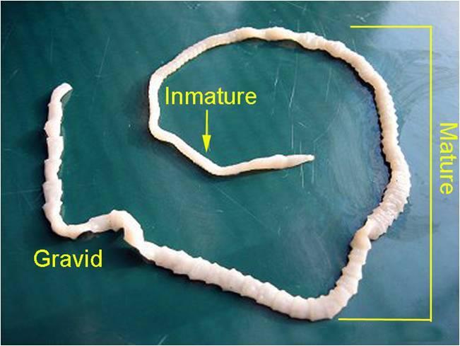Adults - 50cm long 4 unarmed suckers on the scolex Protrusable armed (4-7 rows of hooks) rostellum +++ Segments Barrel shaped gravid proglottids - 10-15 eggs per egg capsule Two genital pores per PG
