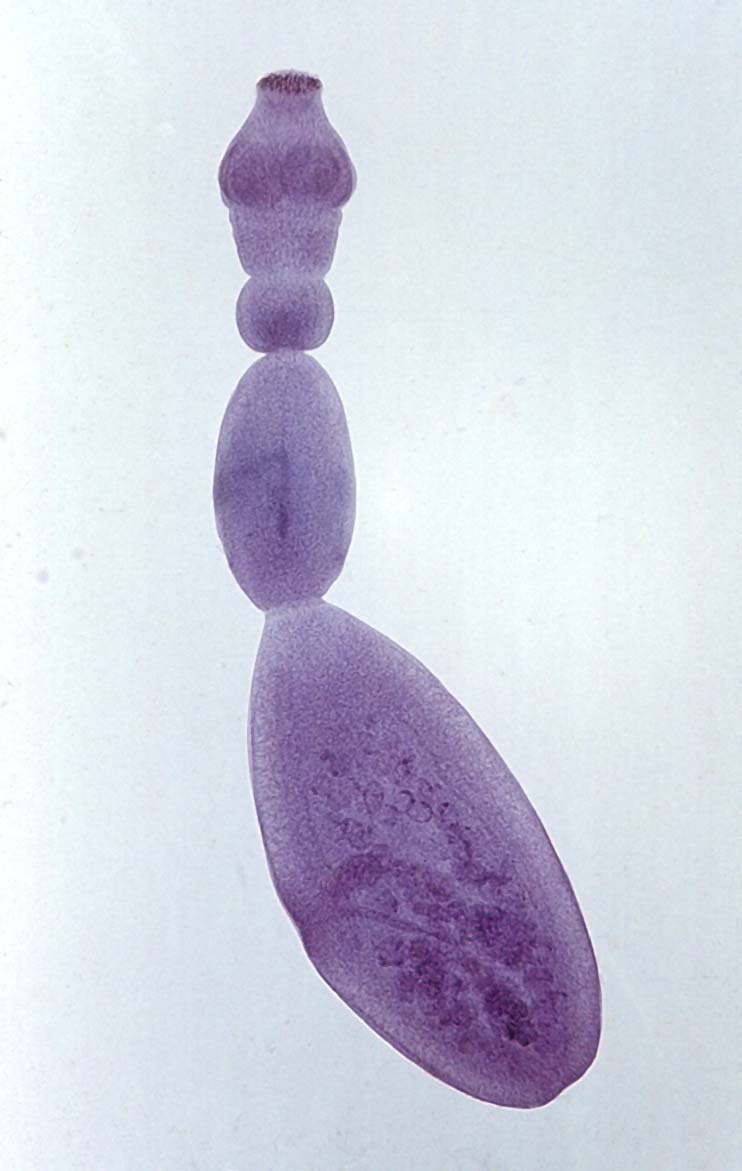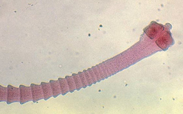 Small adult tapeworm - 5mm Four suckers on scolex Rostellum present