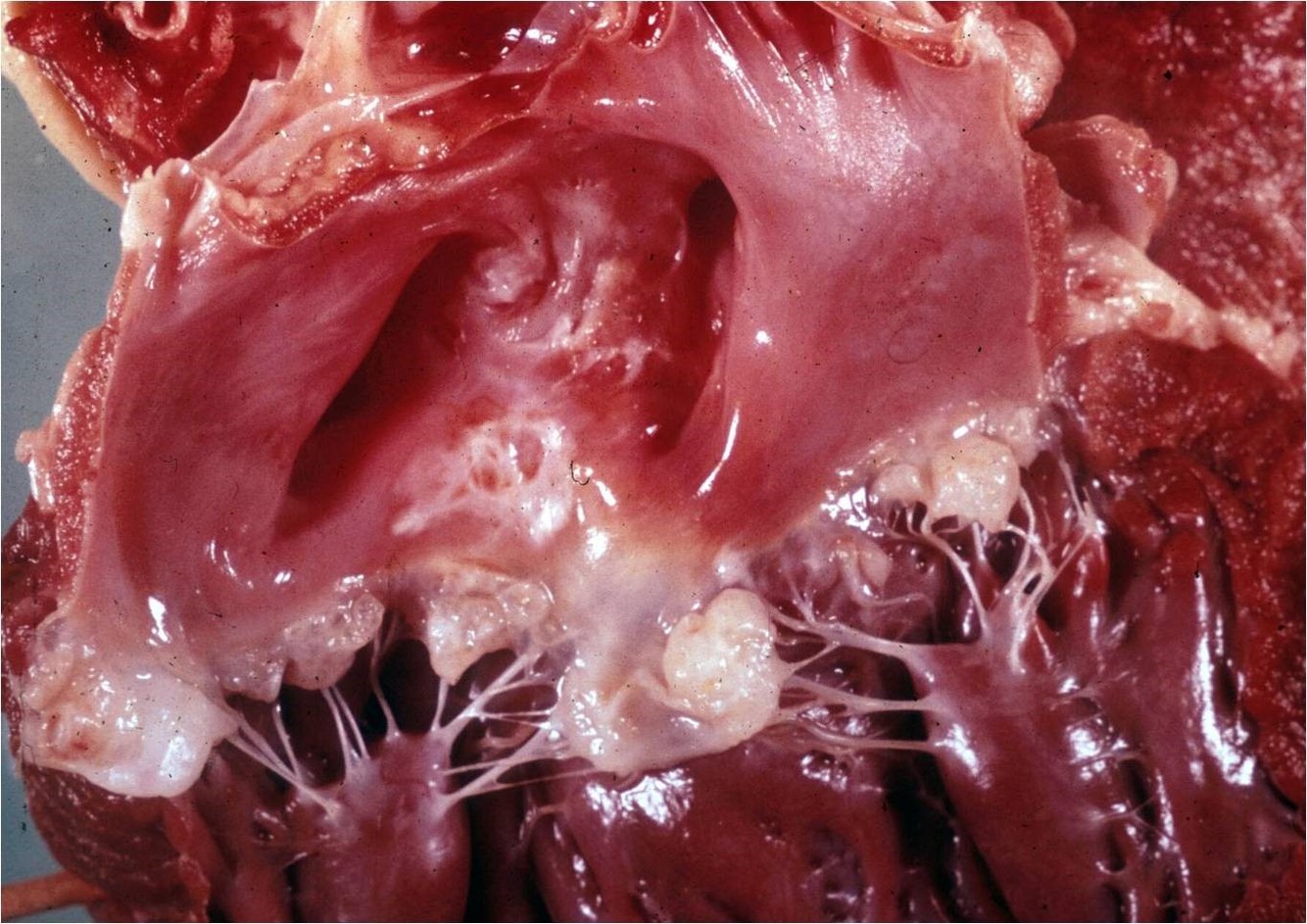 Typical nodular thickenings, this is severe, advanced pathology – this valve wont be very effective as big gaps in it! As blood regurgitates to atrium as a result, we get damage to atrial wall and causes jet lesions which weaken the wall and this atrial wall may rupture
