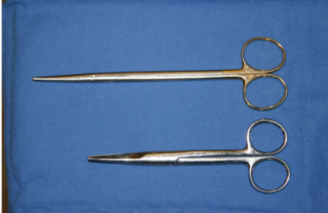 What kind of scissors should be used for fine dissection and what for dissecting connective tissue and fascia?