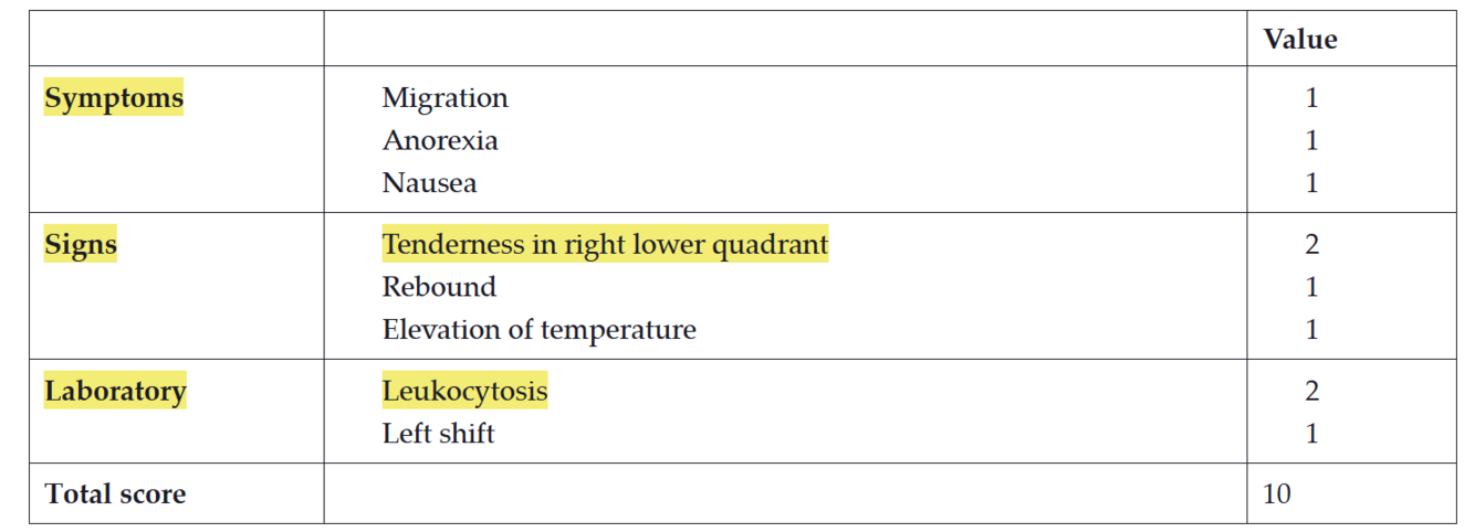 but that a higher score lacked specificity in diagnosing appendicitis as the cause of the patient’s abdominal pain