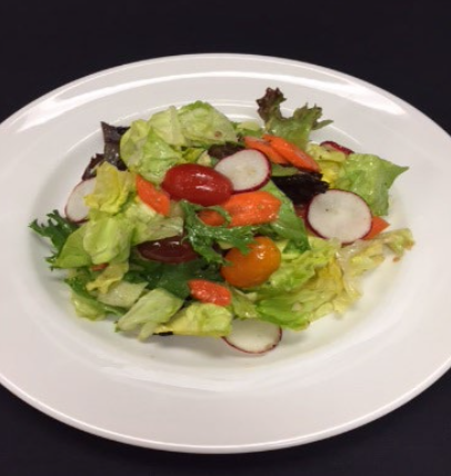 Our house salad consisting of a mixture of butter leaf lettuce and delicate baby greens with radish, tomato and carrots dressed with parmesan vinaigrette and crumbled Gorgonzola cheese upon guest request only.