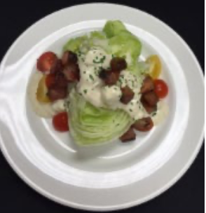 A ¼ head of chilled Iceberg lettuce finished with our creamy bleu cheese dressing, bacon lardons and mixed grape tomatoes.