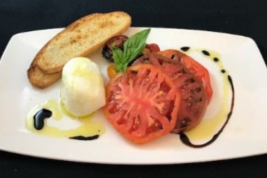 Creamy burrata with sliced heirloom tomatoes, extra virgin olive oil and 15 yr. aged balsamic vinegar. Finished with fleur de sel, fresh basil and pain rustique croutons.