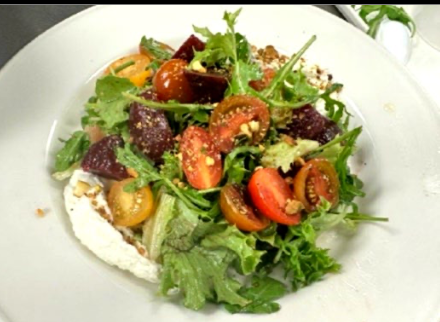 Roasted red beets with mixed greens, arugula, whipped goat cheese, arugula pesto, heirloom tomatoes, crushed pistachios and citrus vinaigrette.